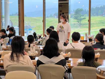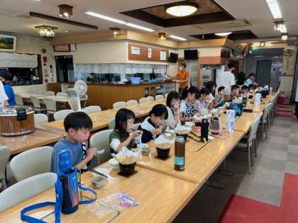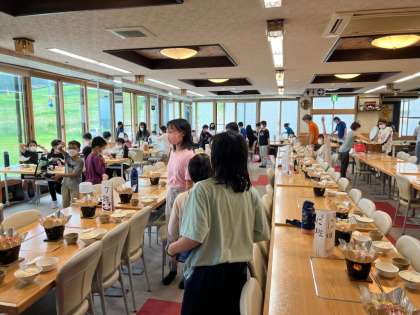 1日目の夕食は鴨なべでした!一人鍋を準備していただいていました。食事係の児童が各班のテーブルの準備をしました。