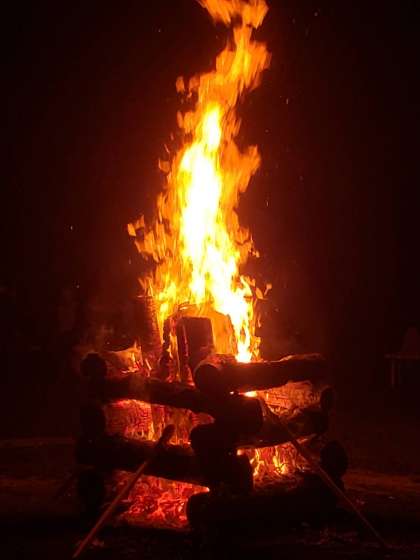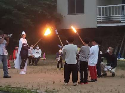 キャンプファイヤー係の子どもたちはリハーサルを行うため18時半頃に集合しました。火の子たちが火の神から炎を渡される場面も上手にリハーサルしました。