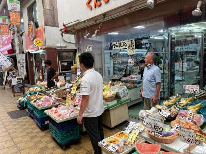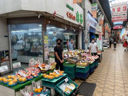 二人の先生は地域の商店街にある果物屋さんで社会体験研修を受けています。