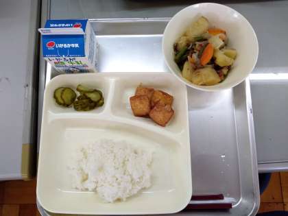 今日の献立は「肉じゃが、あつあげのみそだれかけ、きゅうりのゆずの香あえ、ごはん、牛乳」でした。6年生の修学旅行にあわせて、PTA給食試食会も実施され、46名の保護者の方にも給食を食べていただきました。
