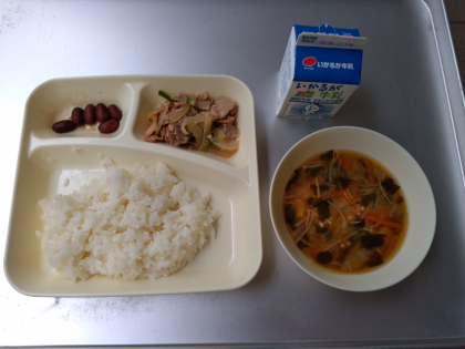 今日の献立は「豚肉の甘辛焼き、みそ汁、金時豆の煮もの、ごはん、牛乳」でした。