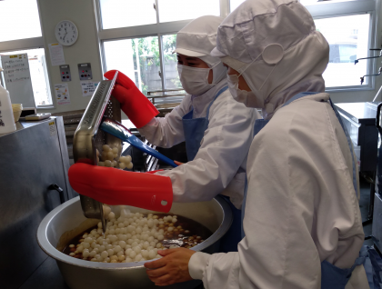 今日は月見の行事献立で「一口がんもとさといものみそ煮、牛肉と野菜のいためもの、みたらしだんご、ごはん、牛乳」でした。みたらしだんごは、冷凍のしらたまだんごを蒸して、砂糖、しょうゆ、でんぷんで作ったタレを絡めます。今年の月見は9月10日です。