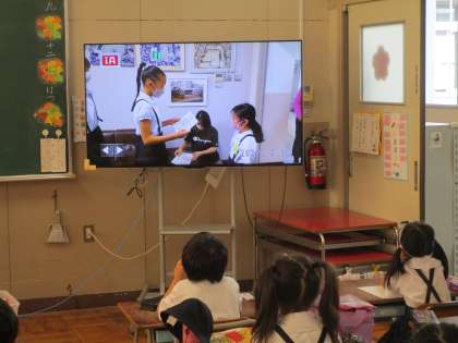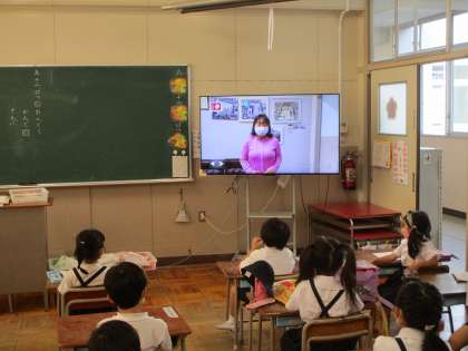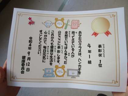 リモートでの児童朝会を行いました。健康委員会の子どもたちがハンカチやティッシュを持っている子どもの数が多かった学級を表彰してくれました。
