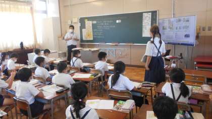 3年生の様子です。1組は社会科、2組は算数科の学習に取り組んでいました。社会科はパン工場について学習し、算数科は割り算の学習に取り組んでいました。