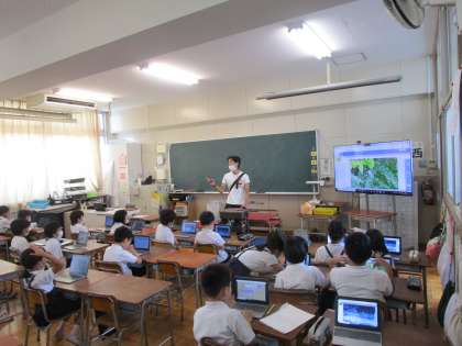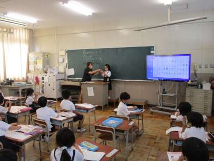 2年生は学習者用端末を使って、文字の入力方法を先生と一緒に取り組んでいました。文字が入力できると活用の幅が広がります。