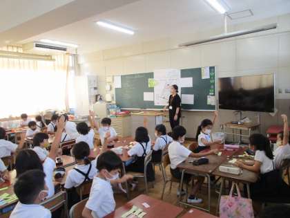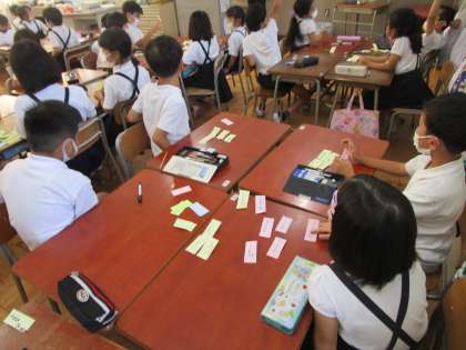 探検が終わり、教室に戻ってからは、子どもたちが歩いたところで見つけたものを出し合い、校区地図に付箋で貼り付けました。校区地図が埋まってしまうほどたくさん付箋を貼ることができました。やはり、学校を出て、実際に歩き、確かめる活動は子どもたちにとって学びが多いです。