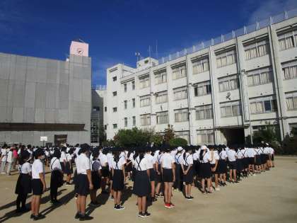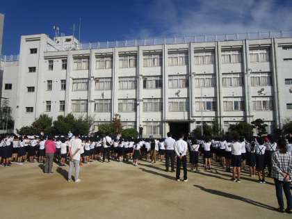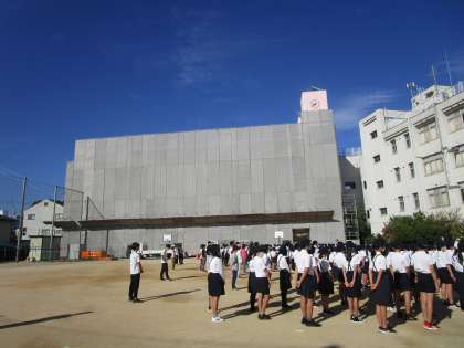 今日から10月の学校生活が始まりました。朝の暑さもおさまり、児童朝会も運動場で行いました。気持ちのいい朝でした。体育館の外壁改修工事も順調に進んでいます。