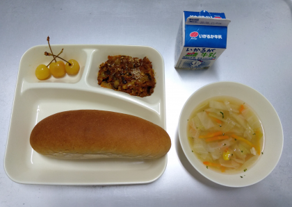 今日の献立は「なすのミートグラタン、鶏肉と野菜のスープ、さくらんぼ(缶)、黒糖パン、牛乳」でした。