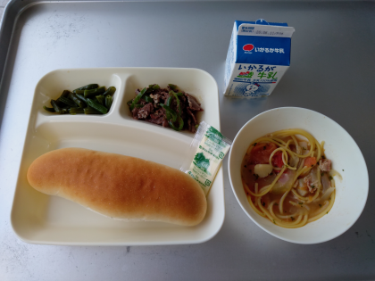 今日の献立は「牛肉の香味焼き、ほたて貝とトマトのスープスパゲッティ、さんどまめのサラダ、コッペパン、ソフトマーガリン、牛乳」でした。