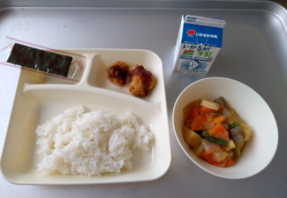 今日の献立は「みそカツ、じゃがいもと野菜の煮もの、焼きのり、ごはん、牛乳」でした。