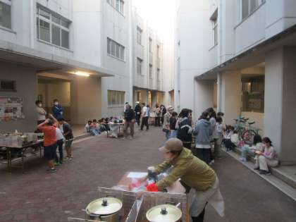 ご飯を食べた後は、運動場でキャンプファイヤーを行いました。青少年指導員の方がリーダーをしていただき、歌やゲームで盛り上げていただきました。学校の運動場でキャンプファイヤーを経験できる子どもたちは幸せです。