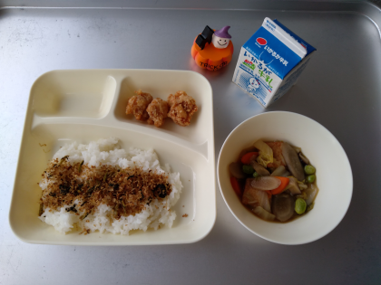 今日の献立は「鶏肉のたつたあげ、あつあげと野菜の煮もの、おかかなっ葉、ごはん、牛乳」でした。