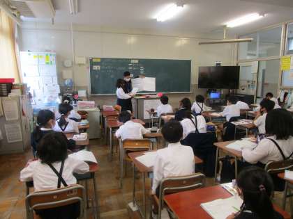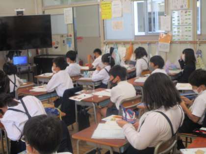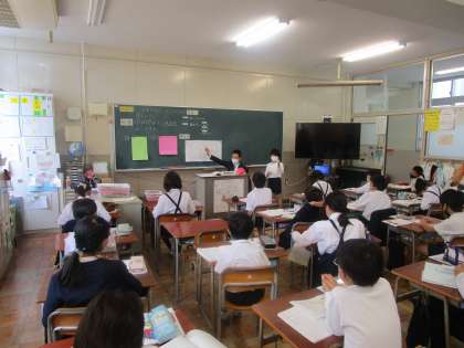 4年生の様子です。4年1組で教育実習生が算数科の研究授業を行いました。2つの形の広さを比べる「面積」の学習でした。子どもたちは一生懸命、広さを比べる方法を考えることができていました。