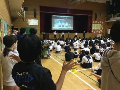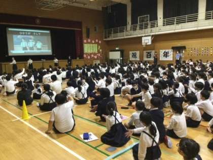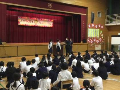 古市100周年フェスティバルはクイズで盛り上がった後、各学年の作ったお祝いムービーへと移ります。各学年の学校紹介や学校の歴史など様々なムービーをみんなで見ました。自然と「おぉ!」と反応が出たり、拍手が出たりして、和やかなムードで見ていました。続く「虹」の歌では、みんなで曲に合わせて手話で歌いました。児童も教職員もみんなの心が一つになり、会場中に笑顔が溢れていました。その後は、“スペシャルゲスト”さんのビデオメッセージ、校長先生のお話がありましたが、みんな真剣に話を聞くことができていました。児童の思い出に残る素敵な集会になったのではないかと思います。