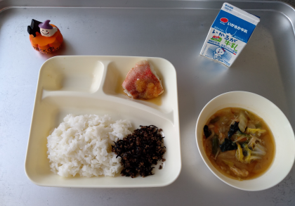 今日の献立は「あかうおのみぞれかけ、みそ汁、牛ひじきそぼろ、ごはん、牛乳」でした。