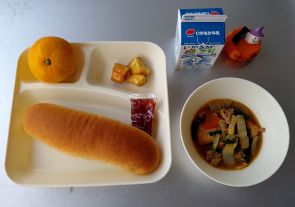 今日の献立は「豚肉といかの中華煮、大学いも、みかん、コッペパン、いちごジャム、牛乳」でした。