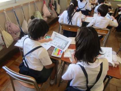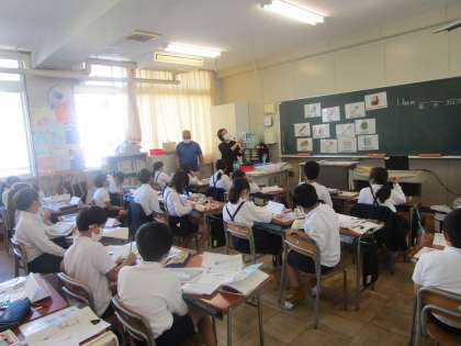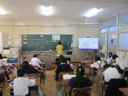 4年生の様子です。算数科と外国語の学習に取り組んでいました。算数科では公式を使って長方形の面積を求める学習、外国語では絵カードを使って文房具の紹介をする学習を行っていました。