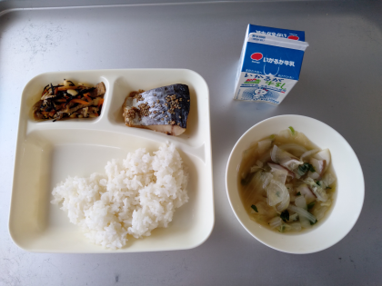 今日の献立は「さごしのごまじょうゆかけ、五目汁、大豆の煮もの、ごはん、牛乳」でした。