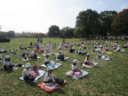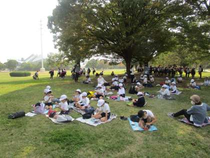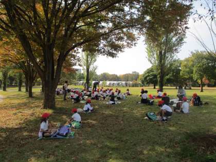 オリエンテーリング終了後は、各学年で集まって、お弁当を食べました。1年・2年・3年生の様子です。