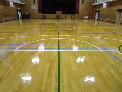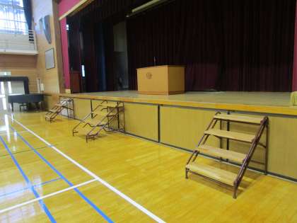 しばらく工事中でした体育館の床が新しくなりました。舞台への昇降台も新しくなりました。床は照明が反射するくらいピカピカです。今日からは体育館シューズに履き替えて授業を行います。床を大切に保持していきたいと思いますのでご準備をお願いいたします。