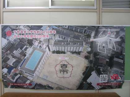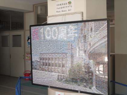 11月26日に行われる「創立150周年・開校100周年」記念式典に向けて準備が進んでいます。玄関には、「古市100周年フェスティバル」で披露したフォトモザイクアートが完成し、学校に届きました。近くで見ると子どもたちの学校での様子を写した写真が貼り付けてあります。