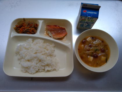 今日の献立は「あかうおのしょうゆだれかけ、なめこのみそ汁、きんぴらごぼう、ごはん、牛乳」でした。