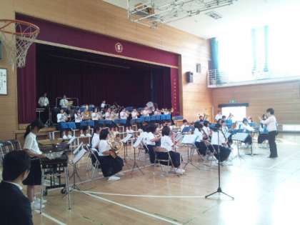 9月14日(土)午後1時30分〜2時30分 古市小学校講堂において今市中学校吹奏楽部を招き「ふれあいコンサート」が開催されました。「ふれあいコンサート」は、3年目をむかえますが、今年から太子橋小学校PTA成人教育委員会と古市小学校はぐくみネット協議会が共催で実施することになりました。この催しも着実に地域に根付き、広がっていることを実感しています。内容を紹介します。