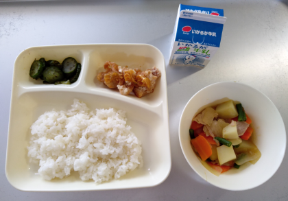 今日の献立は「あげどりのねぎだれかけ、豚肉とじゃがいもの煮もの、きゅうりの赤じそあえ、ごはん、牛乳」でした。