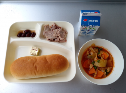今日の献立は「豚肉のガーリック焼き、ケチャップ煮、うずら豆のグラッセ、コッペパン、バター、牛乳」でした。