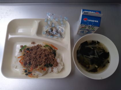 今日の献立は「ビビンバ、わかめスープ、アーモンドフィッシュ、牛乳」でした。