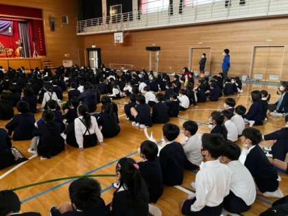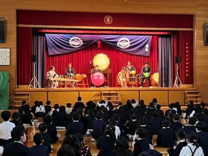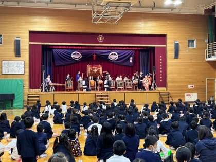 宮太鼓、桶胴太鼓、琴、津軽三味線、篠笛というラインナップで素晴らしい演奏を聴かせていただきました。音を振動で感じられる太鼓の迫力に最初はビックりしていましたが徐々に楽しくなり笑顔いっぱいにノリノリで聴く子どもたちを見ていると、生で音楽を聴けることが大切だと感じました。