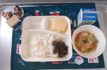 今日の献立は「卵どうふ、一口がんもと野菜の煮もの、魚ひじきそぼろ、ごはん、牛乳」でした。