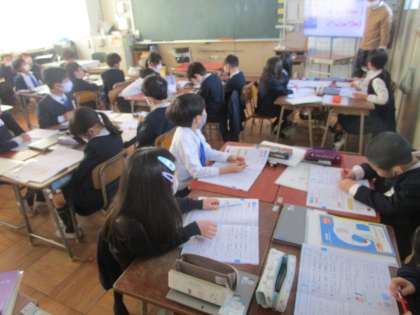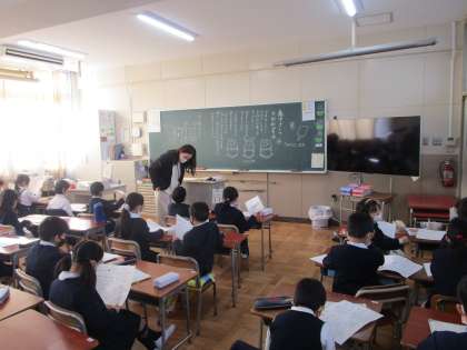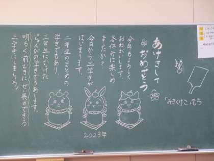 2年生の様子です。黒板には先生から子どもたちへのメッセージが書かれていました。冬休みの課題の確認をみんなで行っていました。