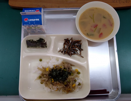 今日は、正月の行事献立で「きんぴらちらし、ぞう煮、ごまめ、牛乳」でした。