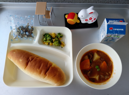 今日の献立は「ビーフシチュー、ブロッコリーとコーンのサラダ、ミニフィッシュ、おさつパン、牛乳」でした。