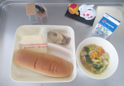 今日の献立は「あじのレモンマリネ、てぼ豆のスープ煮、スライスチーズ、黒糖パン、牛乳」でした。