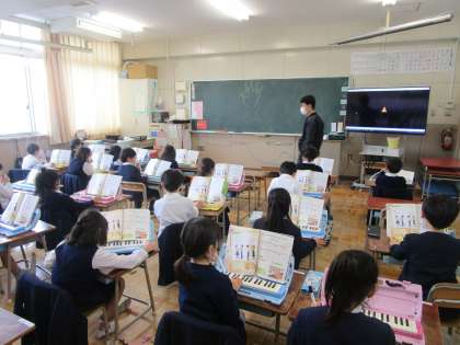 1年生の様子です。音楽科の授業では鍵盤ハーモニカを使って学習していました。子どもたちはどんどん上手に鍵盤ハーモニカを扱うことができるようになっています。