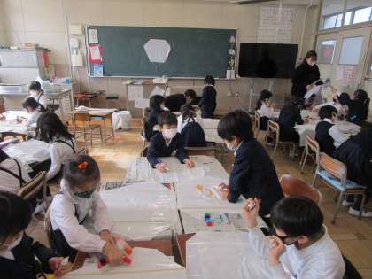 図画工作科では、ビニール凧を作成していました。自分の好きなイラストを凧にかいていました。完成した凧を使って運動場で凧揚げするのが楽しみです。