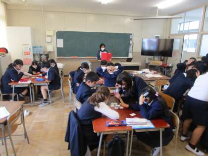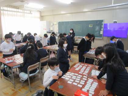 4年生の様子です。国語科の授業で百人一首のかるたをグループで行っていました。上の句下の句を覚えて、先生が読み始めると、素早く札をとる子どももいました。すごいです!