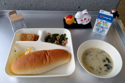 今日の献立は「はくさいのクリーム煮、あつあげのごまじょうゆかけ、豚肉とさんどまめのオイスターソースいため、コッペパン、マーマレード、牛乳」でした。