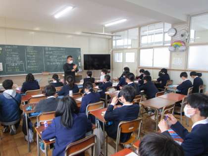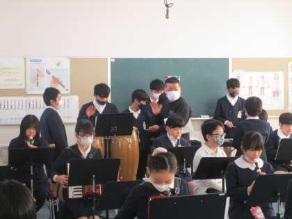 6年生の様子です。今日は中学校の数学の先生が来られる日でした。1組は算数科の学習で中学校の学習内容「絶対値」について教えていただきました。2組は音楽科で取り組んでいる「アフリカンシンフォニー」の合奏を特別に指導していただきました。吹奏楽部の顧問をされていますので大変ありがたいです。