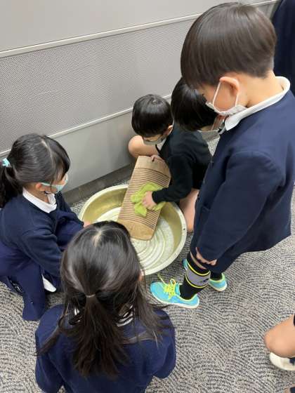洗濯板で洗濯をしたり、脱水する体験をしたりしました!