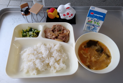 今日の献立は「豚肉のごまだれ焼き、みそ汁、きくなとはくさいのごまあえ、ごはん、牛乳」でした。