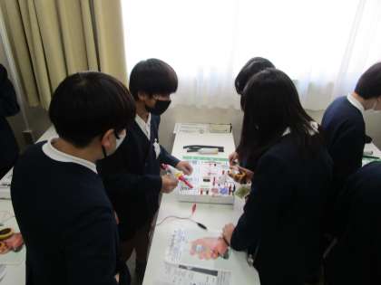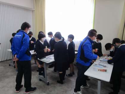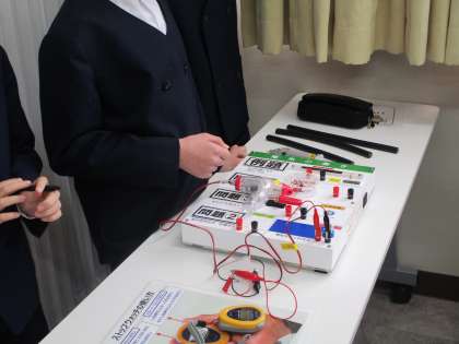 グループごとに電気のはたらきについて実験できるように準備していただきました。手回し発電機で蓄電し、羽を回したり、オルゴールを鳴らしたりしました。同じ電気の量で豆電球とLED照明のついている長さを比べる実験も行いました。LED照明のついている時間の長さに子どもたちはびっくりしていました。