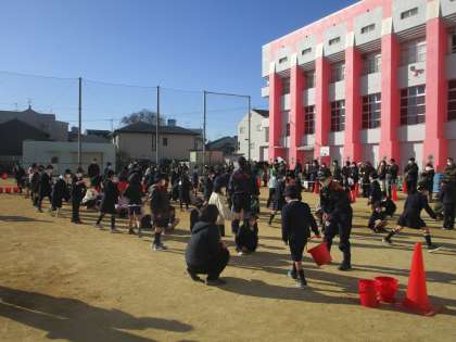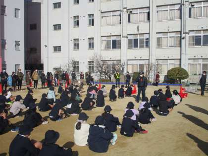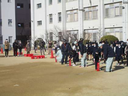 4年生の様子です。4年生は消防署、地域の皆様と一緒にバケツリレー、水消火器の放水体験をしました。4年生は実際に自分たちも救助活動に協力することを前提に学習しました。自分たちの生活に関わることと実感できました。
