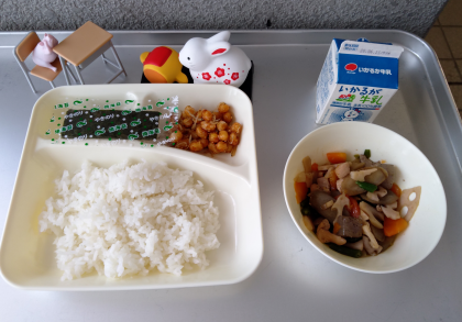 今日の献立は「筑前煮、じゃこ豆、焼きのり、ごはん、牛乳」でした。