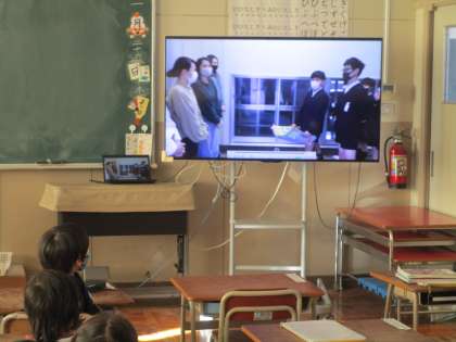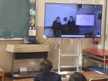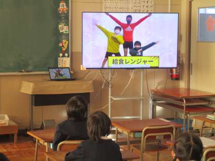 児童集会の時間に給食委員会の発表を行いました。1月24日(火)から1月30日(月)は全国給食週間です。学校給食は100年以上の歴史があります。給食を毎日作っていただいている調理員さんに日ごろの感謝の気持ちをメッセージに記し、給食委員会の子どもたちが代表で渡してくれました。給食委員会が作成した動画では、給食に関わるクイズや残さず食べるように呼びかけるショートムービーが紹介されました。毎日の給食をしっかり食べる古市小学校の子どもたちであってもらいたいと思います。