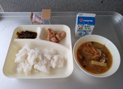 今日の献立は「まぐろの甘辛焼き、豚汁、くきわかめのつくだ煮、ごはん、牛乳」でした。