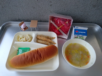 今日の献立は「わかさぎフライ、コーンとはくさいのスープ、カリフラワーのサラダ、コッペパン、りんごジャム、牛乳」でした。