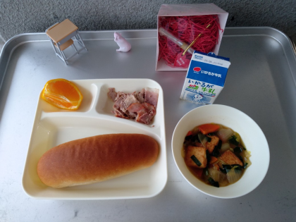 今日の献立は「豚肉のオイスターソース焼き、あつあげと野菜の中華煮、デコポン、黒糖パン、牛乳」でした。